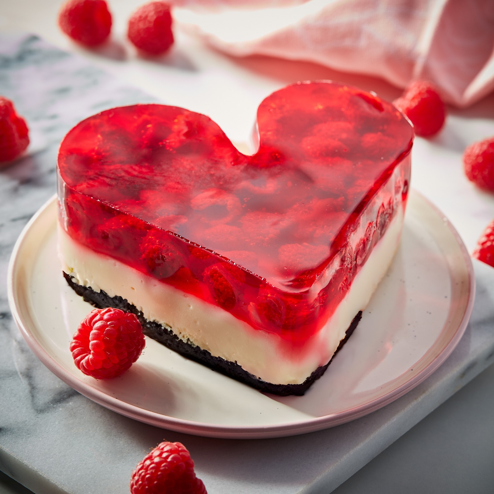 Sernik na zimno w kształcie serca, na bazie serka z kawałkami brzoskwini w środku; całość przykryta pokruszoną maliną w galaretce